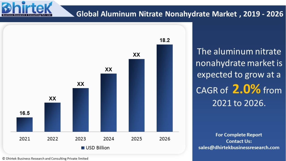 The global market for aluminum nitrate nonahydrate is expected to grow from $ 16,554.8 million in 2021 to $ 18,277.9 million in 2026. The market is expected to grow at a CAGR of 2.0% over the forecast period (2021-2026). Some of the market's key participants are Chongqing Hua'nan, Nithyasri Chemicals, Orrion Chemicals, Shijiazhuang Xuanran, Strem Chemicals, Taiyuan Bohui, Taiyuan Xinyufeng, Thatcher Group, XiaXian Yunli. This report intends to identify significant growth areas and to explore relevant market strategies. This in-depth analysis delves into the global market for aluminum nitrate nonahydrate. The primary goal of this research is to examine the potential growth areas, significant trends, and the market's impact on the industry. The report also reviews the adoption of aluminum nitrate nonahydrate in both established and emerging markets.