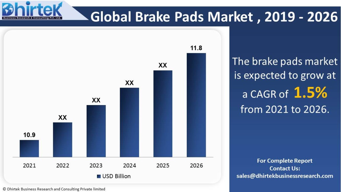 The global market for brake pads is expected to grow from $ 10,979.6 million in 2021 to $ 11,828.2 million in 2026. The market is expected to grow at a CAGR of 1.5% over the forecast period (2021-2026). Some of the market's key participants are ABS Friction, ADVICS, ATE, Acdelco, Akebono, BOSCH, BREMBO, Brake Parts Inc, Delphi Automotive, Double Link, EBC Brakes, Federal Mogul, Fras-le, Hitachi Chemical, Hunan BoYun, ICER, ITT Corporation, MAT Holdings, Nisshinbo Group Company, SAL-FER, Sangsin Brake, Shandong Gold Phoenix, Shangdong xinyi, Sumitomo, TRW. This report intends to identify significant growth areas and to explore relevant market strategies. This in-depth analysis delves into the global market for brake pads. The primary goal of this research is to examine the potential growth areas, significant trends, and the market's impact on the industry. The report also reviews the adoption of brake pads in both established and emerging markets.