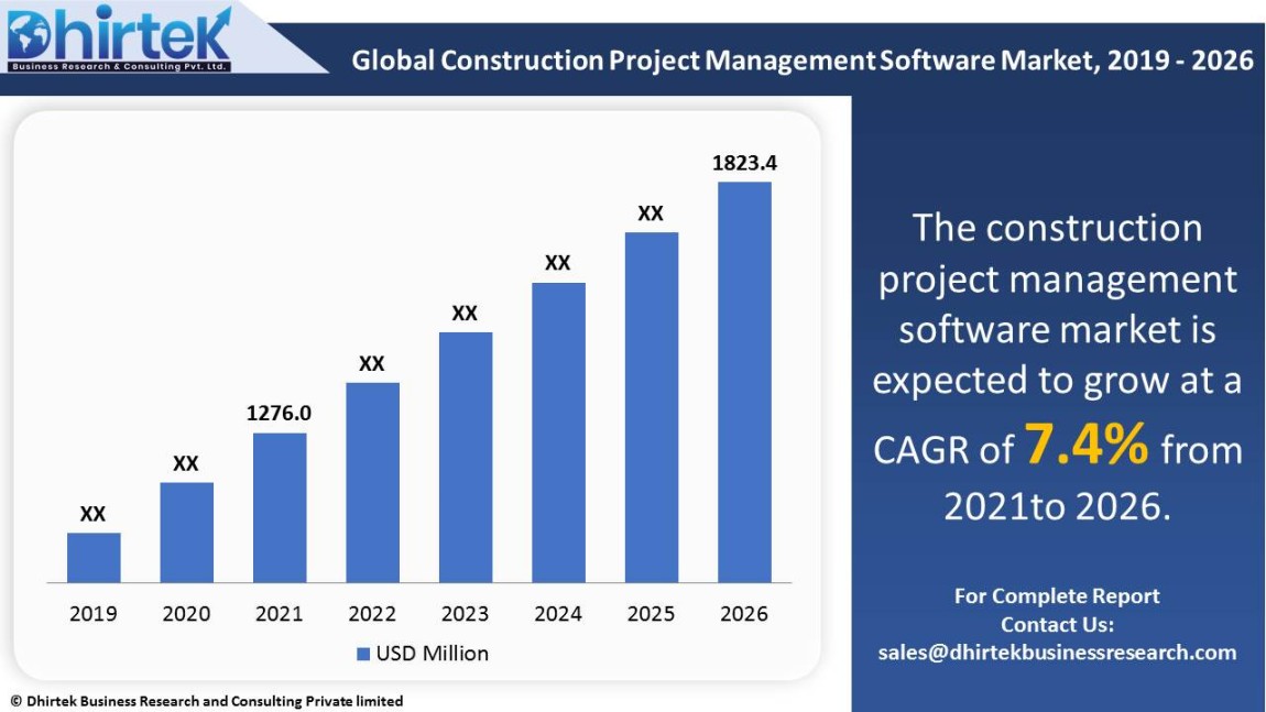 The global market for construction project management software is expected to grow from $ 1,276.0 million in 2021 to $ 1,823.4 million in 2026. The market is expected to grow at a CAGR of 7.4% over the forecast period (2021-2026). Some of the market's key participants are Aconex Ltd, Buildertrend, CMiC, Co-construct, Fieldwire, GLODON, Jiansoft, Jinshisoft, Jonas, Microsoft, MyCollab, Odoo S.A, Oracle, Other, Procore, RedTeam, Sage, Viewpoint, Inc, Yonyou, e-Builder, eSUB. This report intends to identify significant growth areas and to explore relevant market strategies. This in-depth analysis delves into the global market for construction project management software. The primary goal of this research is to examine the potential growth areas, significant trends, and the market's impact on the industry. The report also reviews the adoption of construction project management software in both established and emerging markets.