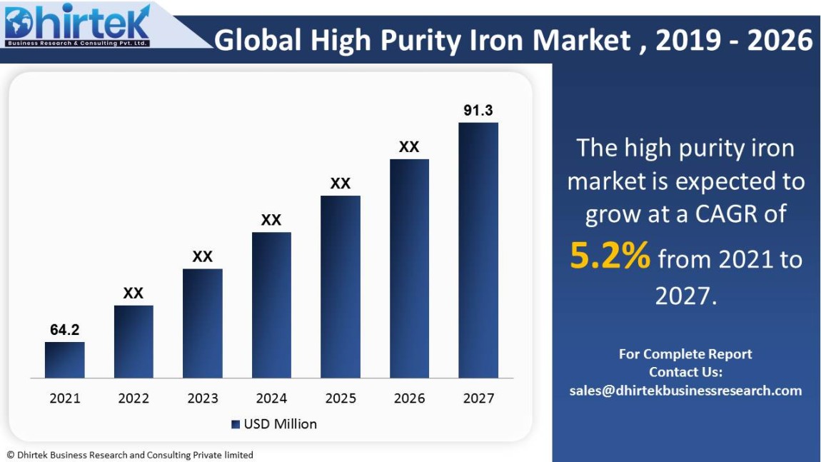 The global market for high purity iron is expected to grow from $ 64.2 million in 2021 to $ 91.3 million in 2027. The market is expected to grow at a CAGR of 5.2% over the forecast period (2021-2027). Some of the market's key participants are Allied Metals, ESPI, Industrial Metal Powders India Pvt.Ltd, Shanghai Pantian, Shanghai Zhiyue, TOHO Zinc, Tritrust Industrial, Zhongnuo Xincai. This report intends to identify significant growth areas and to explore relevant market strategies. This in-depth analysis delves into the global market for high purity iron. The primary goal of this research is to examine the potential growth areas, significant trends, and the market's impact on the industry. The report also reviews the adoption of high purity iron in both established and emerging markets.