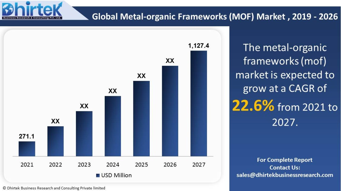 The global market for metal-organic frameworks (mof) is expected to grow from $ 271.1 million in 2021 to $ 1,127.4 million in 2027. The market is expected to grow at a CAGR of 22.6% over the forecast period (2021-2027). Some of the market's key participants are BASF, Framergy, Inc., MOF Technologies, MOFapps, Strem Chemicals. This report intends to identify significant growth areas and to explore relevant market strategies. This in-depth analysis delves into the global market for metal-organic frameworks (mof). The primary goal of this research is to examine the potential growth areas, significant trends, and the market's impact on the industry. The report also reviews the adoption of metal-organic frameworks (mof) in both established and emerging markets.