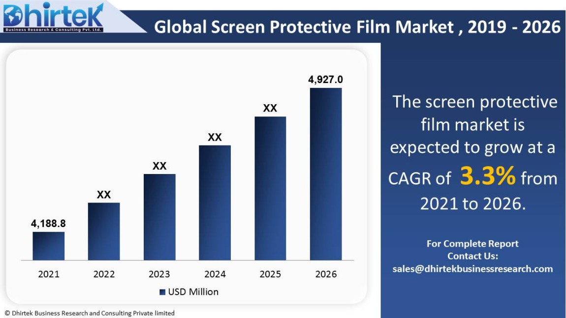 The global market for screen protective film is expected to grow from $ 4,188.8 million in 2021 to $ 4,927.0 million in 2026. The market is expected to grow at a CAGR of 3.3% over the forecast period (2021-2026). Some of the market's key participants are 3M, Air-J, Amplim, BELKIN, Benks, BodyGuardz, CROCFOL, Capdase, Crystal Armor, DEFF, Halo Screen Protector Film, Kindwei, MOSHI, Momax, Nillkin, NuShield, OtterBox, PanzerGlass, PowerSupport, Screen Cares, Simplism, Spigen, Tech Armor, XtremeGuard, ZAGG, Zupool, iCarez, intelliARMOR. This report intends to identify significant growth areas and to explore relevant market strategies. This in-depth analysis delves into the global market for screen protective film. The primary goal of this research is to examine the potential growth areas, significant trends, and the market's impact on the industry. The report also reviews the adoption of screen protective film in both established and emerging markets.